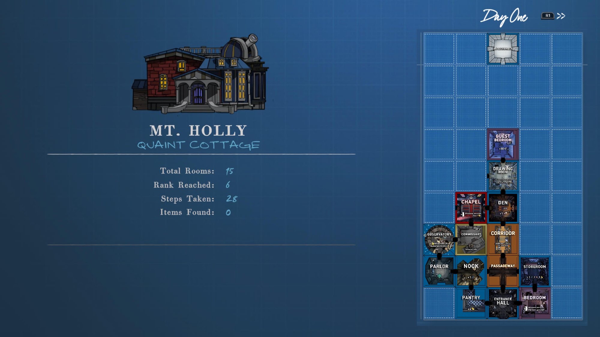 At the end of each in-game day, when you either call it quits or run out of steps, you get a summary of your activity. The game places your creation into one of several categories, like “villa” or “cottage,” shows your final blueprint for that day, and tells you the number of rooms drafted, steps taken, items found, etc. When you start Day 2, and every subsequent day thereafter, the manor resets, leaving you with just the Entrance Hall and Antechamber again. Hopefully, you have an idea of what Blue Prince is all about because this is when I get into what frustrates me about this game.