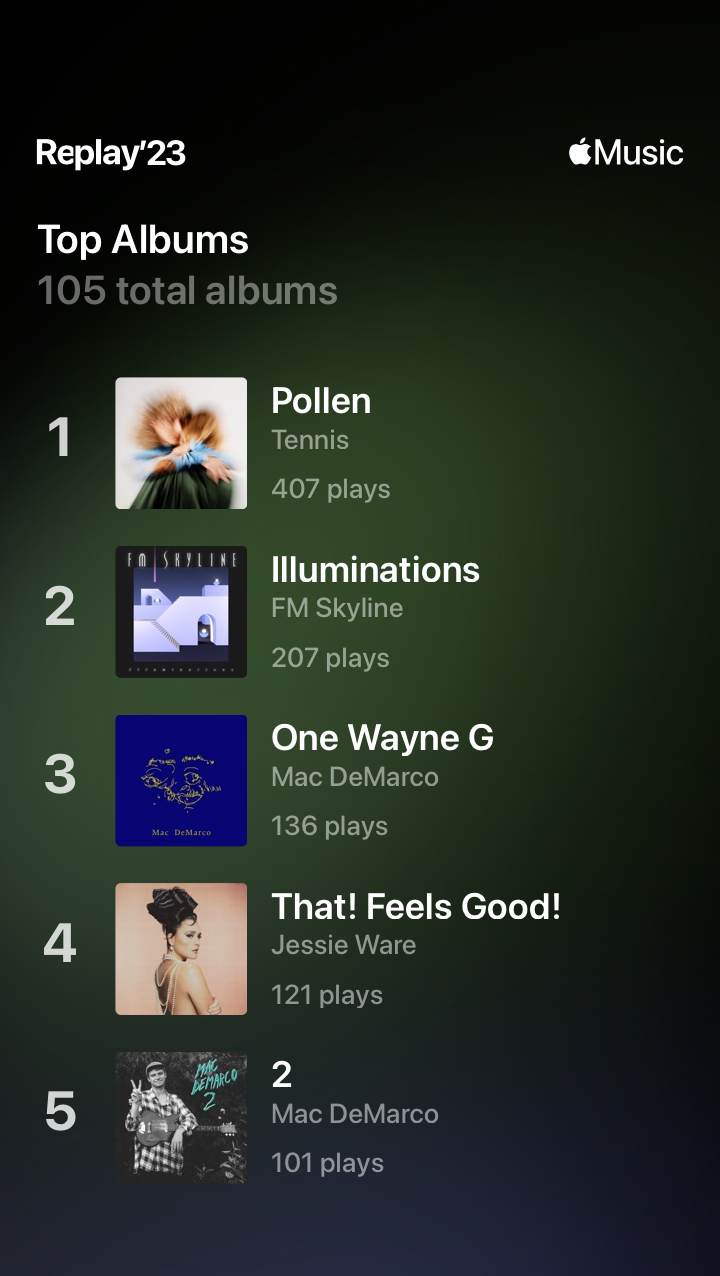 In my previous post, I explained my understanding of Tennis’s song “Swimmer.” There, I mentioned that throughout 2023, I listened to Tennis’s album Pollen to the exclusion of just about everything else, and that was not an exaggeration. Apple Music tells me in 2023, I listened to Pollen at least 407 times. That’s 1,543 minutes, or about 26 hours. My next most-listened to album from that year is FM Skyline’s Illuminations at 207 plays.