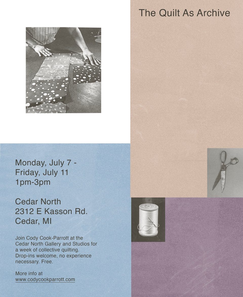 🪡 My first solo show The Quilt As Archive opens July 12 5-8 at Cedar North. I will also be hosting community sewing hours July 7-11 from 1-3 pm at the gallery to work on a group raffle quilt. Free + drop ins welcome, no sewing experience required and sewing machines provided.