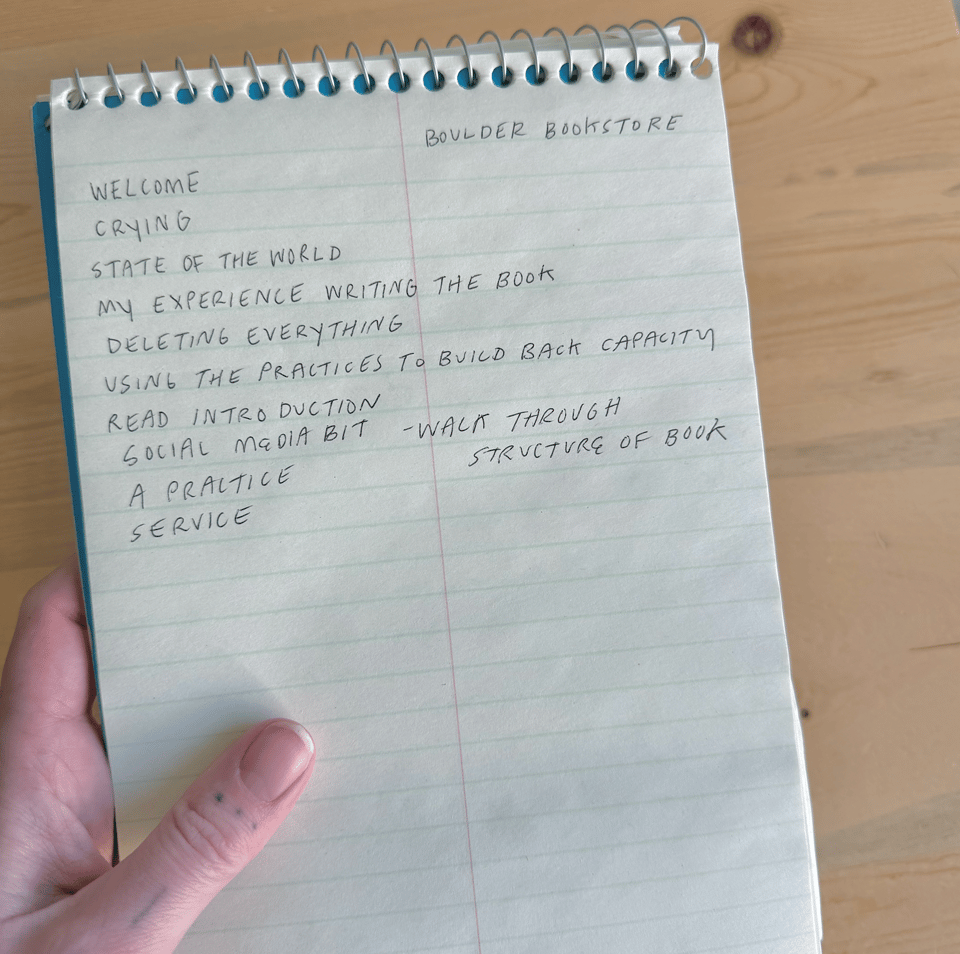 To prepare for the talk and reading I wrote an agenda. Partly because I wanted to stay on track, but also because I wanted to address the fact that I knew I would cry. Not beautiful silent tears or choke up a bit, I knew I would weep audibly into the microphone.