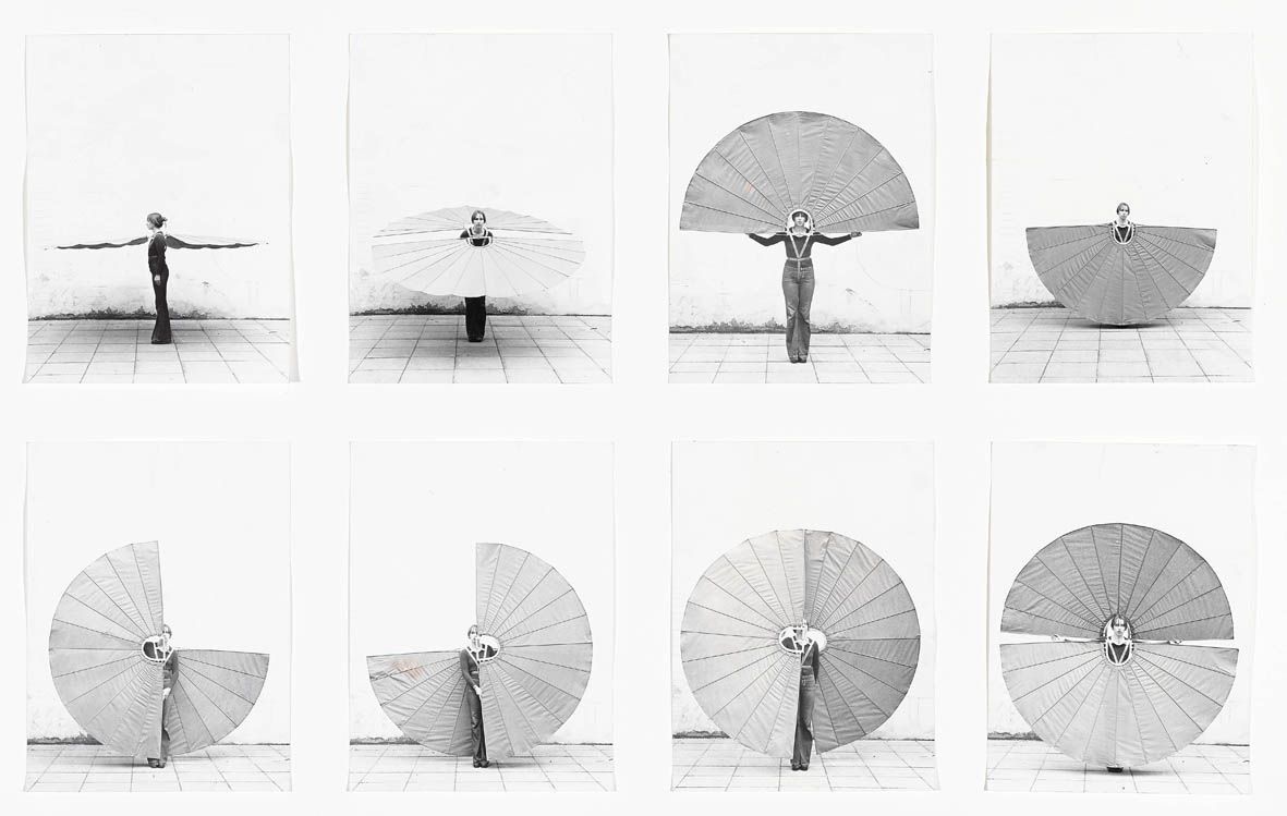 “The fan is adjusted to the proportions and dimensions of my body ... head and shoulders are the centre, the axel of the circular movements ... one half of the fan rotates in front of my body, the other behind my body. My body becomes the fixed axel of the rotational movements. Through the slow rotation of the two fan halves, parts of my body become visible, others become hidden. In the constantly changing angle of the circle the two fan halves spin faster, closing to form a transparent circle.” – Rebecca Horn explains Mechanical Body Fan series