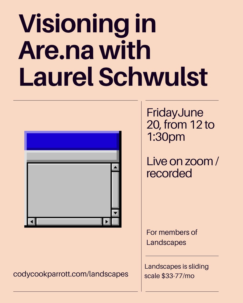 This week Friday at 12pm EST I am delighted to be hosting Laurel Schwulst inside of the Landscapes ecosystem. Laurel will be giving an Are.na talk — an informal hour about how she works, how she collects ideas, and how she trusts the shape that things want to take. Laurel’s practice reminds me that the internet can still feel like a garden, or a bookshelf, or a half open window where ideas land on your desk and you shuffle them around and then create new work.
