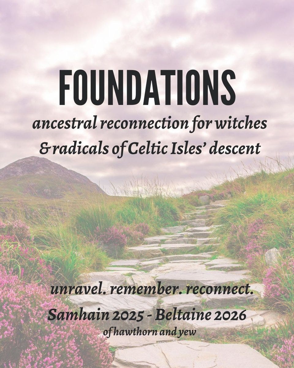 This extremely cool online class is coming up and I want to tell you all about it : Foundations: ancestral reconnection for witches & radicals of Celtic Isles descent is an online program for settlers in diaspora to reweave connection to ancestry & root down into land. Over the course of 6 months, we meet plants, remember folkways, disentangle whiteness and dream together toward a just world. Foundations is running for the fifth time from Oct 2025 - April 2026. Enrollment is now open! This program is intended for folks whose people come from Ireland, Scotland and Wales. Join us this dark season to reconnect to severed culture & remember who we are, in service to a world beyond whiteness.