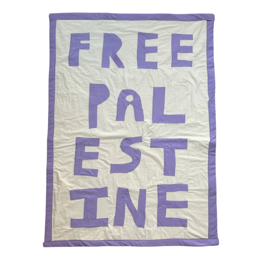 I originally made this banner to process my own grief, share it publicly, and hang it in my studio. I feel now that this banner may belong to someone else and to use it to generate funds for The Sameer Project : A donations based aid initiative working to supply emergency funding to the displaced families in Gaza.