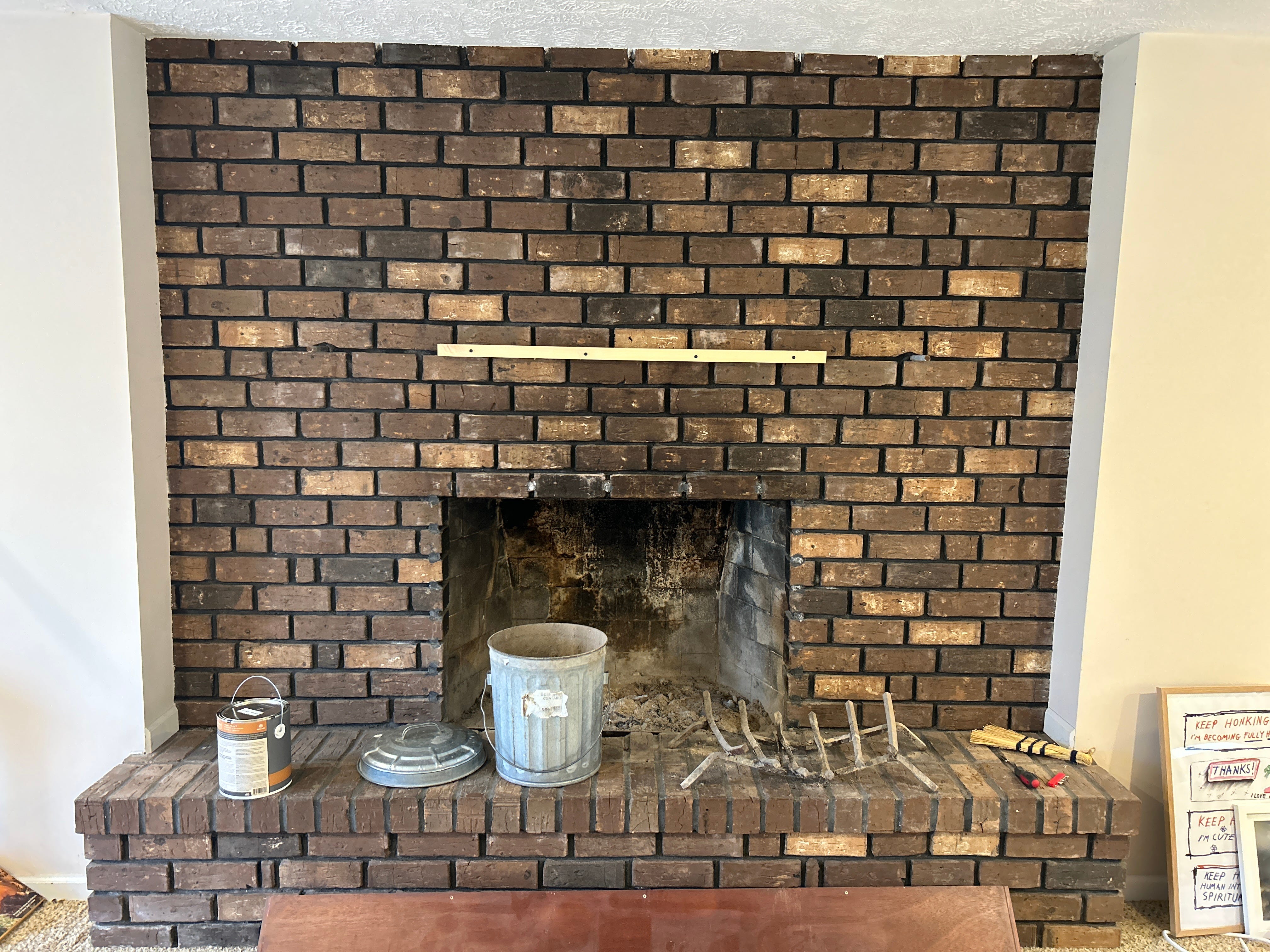Below is the original fireplace after I took the insert out with a crow bar and a screw driver and got it ready to paint. Owning a crowbar feels very cool, another thing in the homeowner toolbox I didn’t know I’d need until I needed it. I started with a coat of lime wash because I was going to lime wash it but then I ran out of what I ordered and had to stop short.