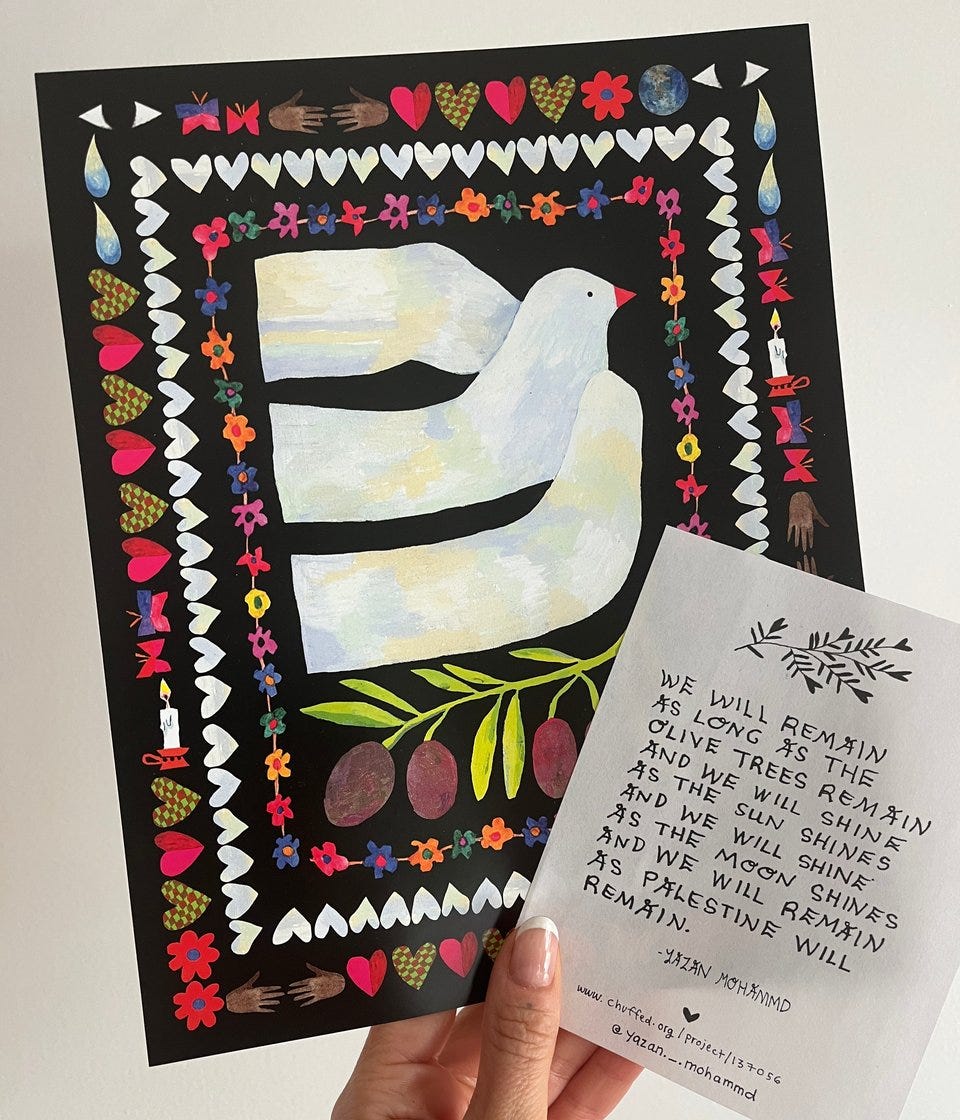 This morning from my dear friend Chelsea Granger : Want to buy a beautiful art print that directly supports a teenager in Gaza organizing for his family and community? There are two versions Print for Yazan - Etsy and Print for Yazan 2 - Etsy Each print comes with a piece of Yazan’s beautiful writing.
