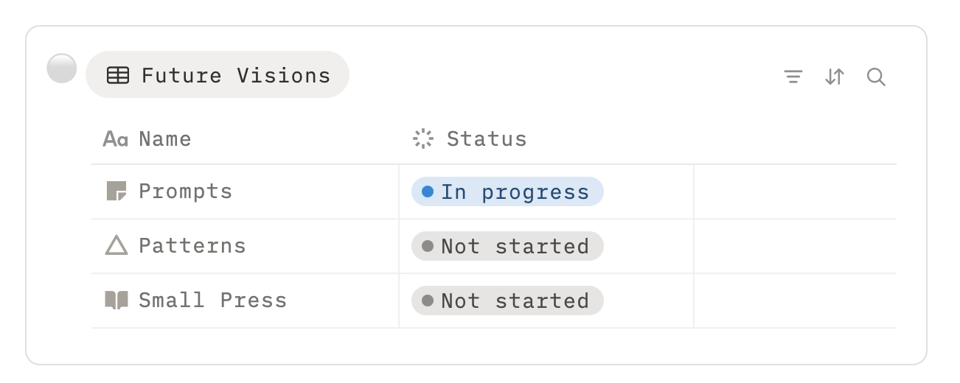 → Went through and updated the Future Visions database pages with my projects : Prompts, Patterns, and Small Press - explaining more about what each one is and timelines of working on them