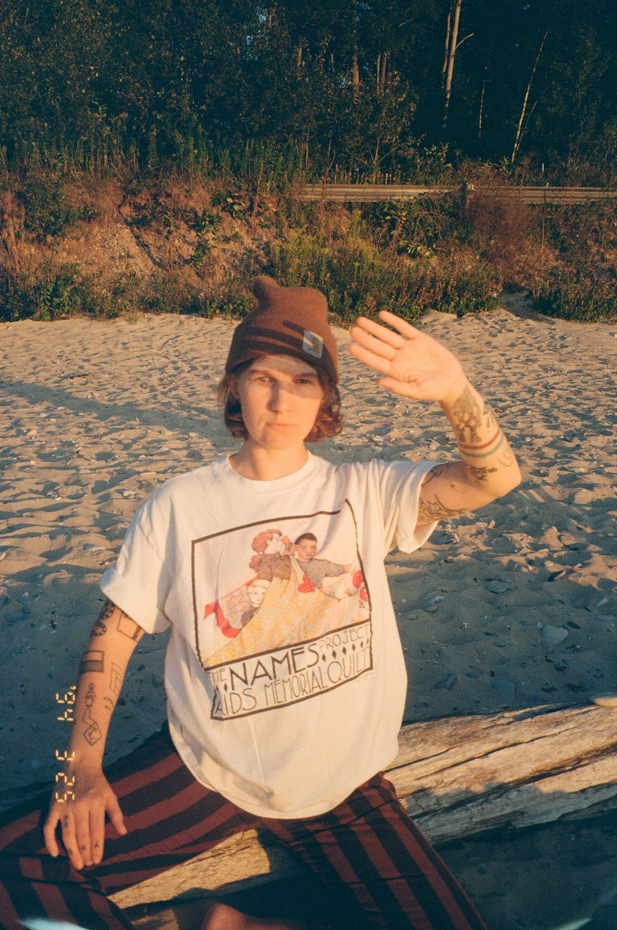 Photo of me on the beach in my NAMES Project AIDS Memorial Quilt Shirt by little brother Sam Cook-Parrott
