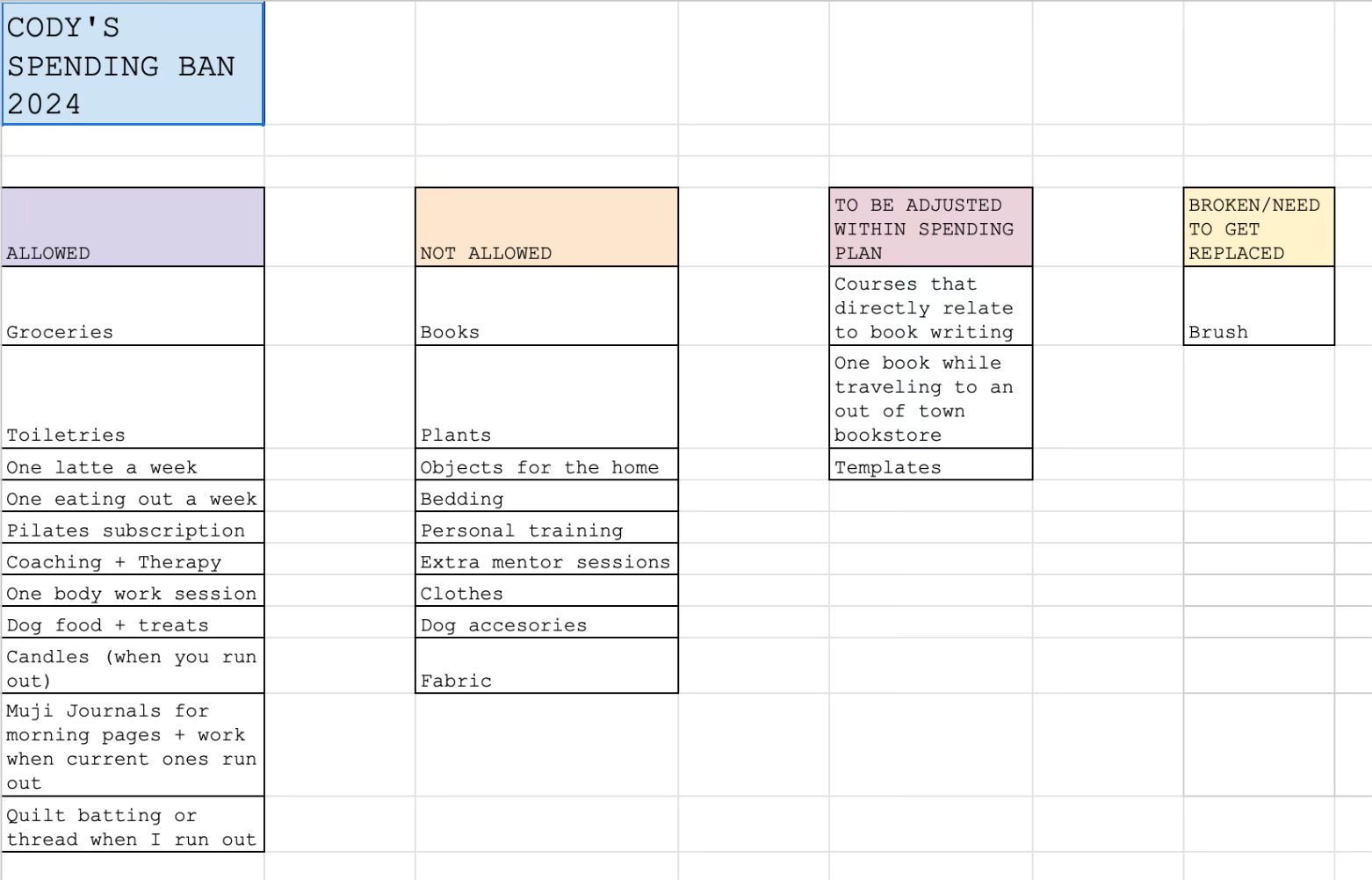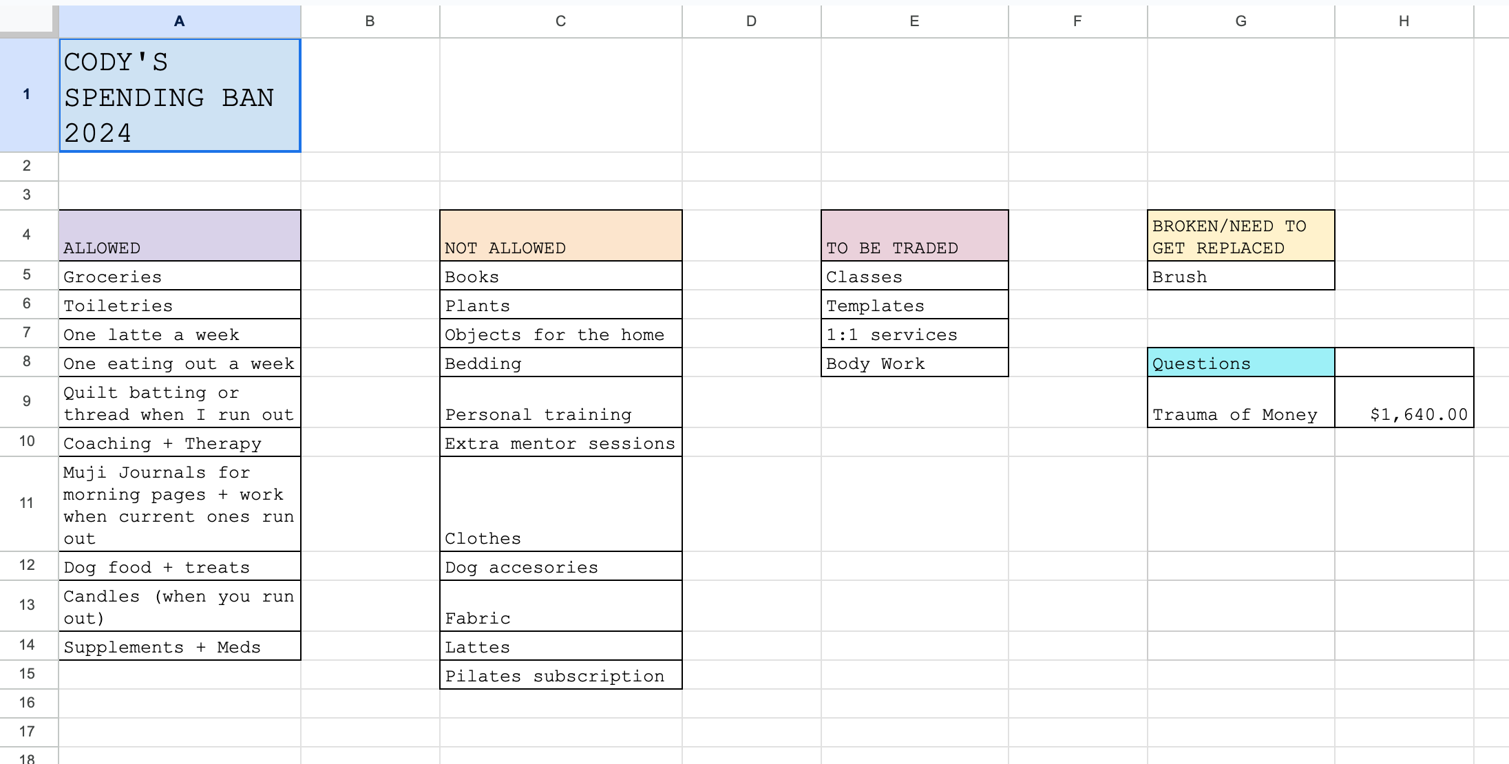 It is generally recommended to try this for a minimum of 1-3 months, but of course you could test it over a weekend if you wanted to. My plan is to revaluate at the end of the year and continue the spending ban for all of next year. One of my tweaks is I have an interest in taking the Trauma of Money course this Spring and I want to see if I can work it into my spending plan. Thank you to those of you who suggested it to me.