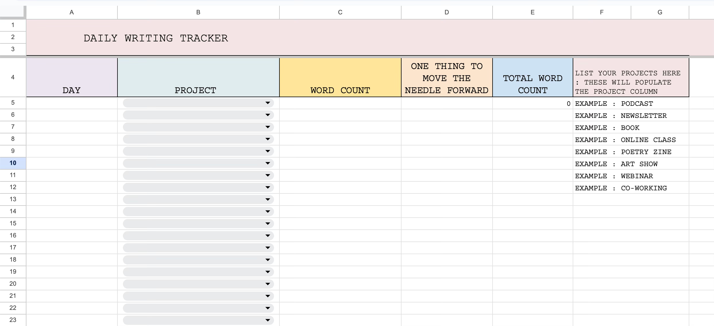 The daily writing tracker also includes prompts to get you closer to knowing what it is you want to write about, organize your ideas, and more. It’s a bit of a sneak peek into the more robust google sheet template we will be using together in Week One of Writing the Personal - the class I am teaching with and that starts this upcoming Sunday December 8 and runs through December 22 when the light returns.