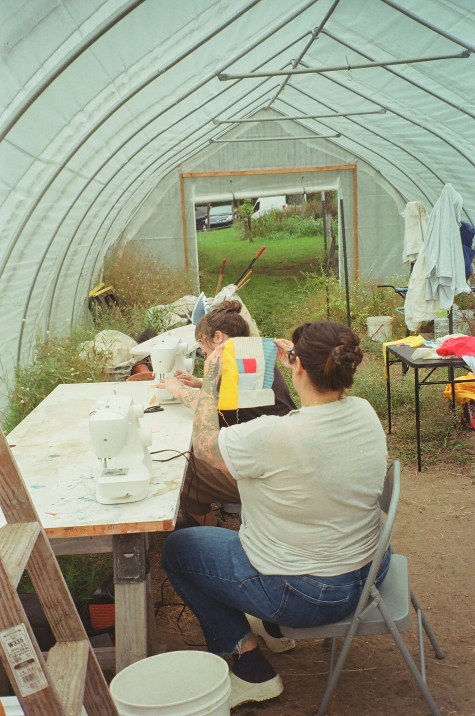 Me and Ellen brought small generators and long extension cords that allowed for a pop up studio in the old hoop house as it trickled down rain all day. The next day the rest of the team was excited to join the hoop house crew outside and almost everyone had turned an outdoor table into their portable studio. A quilt is something human, a quilt is something a part of the land. A quilt is something a part of the everything.
