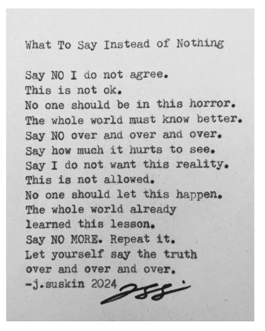 This is the irresistibility. The feeling of bringing our art into the actions that these times demand of us. I think of all the protests and actions happening everywhere and how they are all sprinkled with art. Spray painted banners, art making at the student encampments, the hand written yard sign in my hometown of Cedar that says Gaza children are starving.