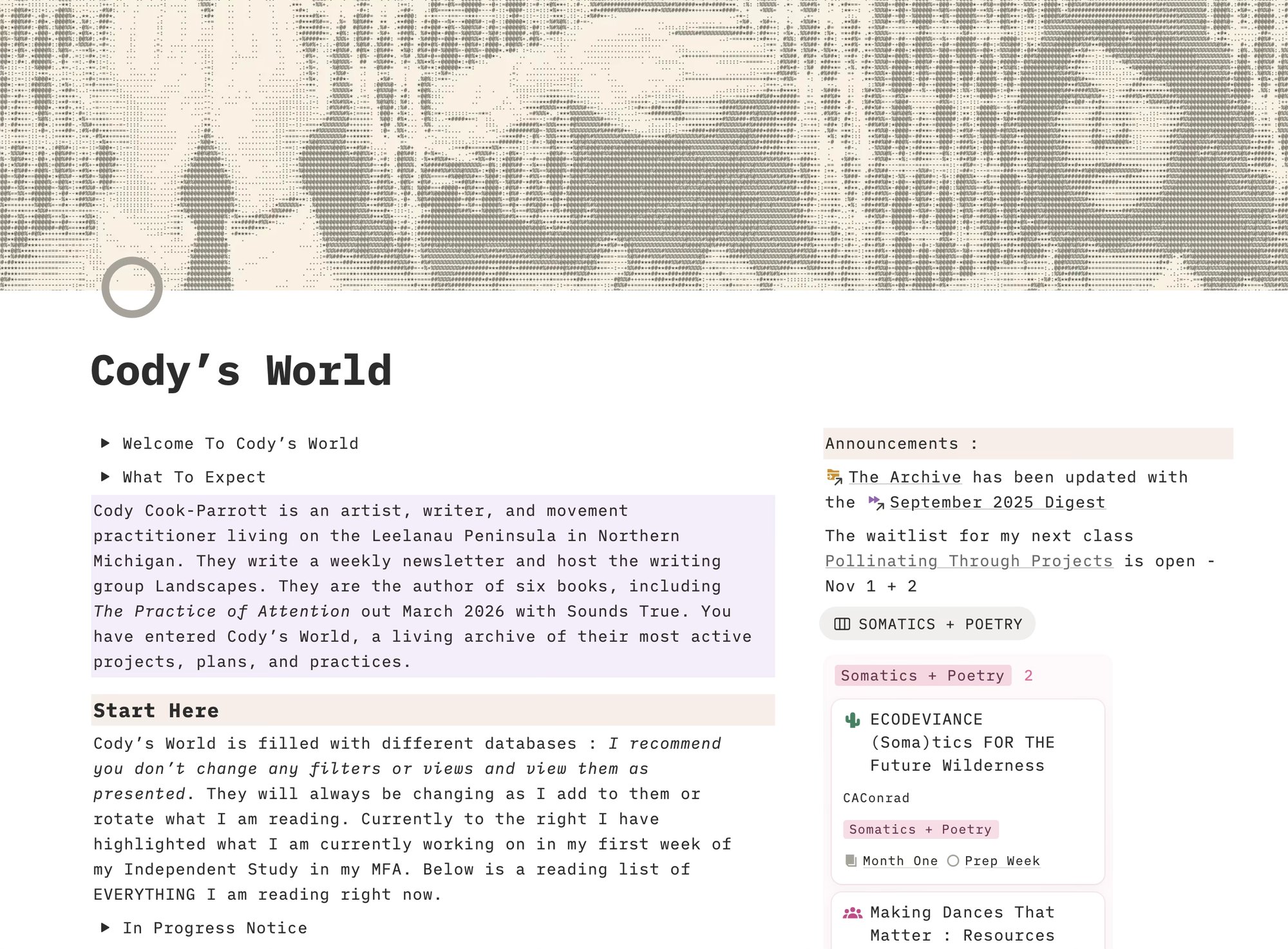 If you’re new here, I’m Cody Cook-Parrott — a writer, artist, and movement practitioner exploring attention, practice, and systems. I’ve sent out Monday Monday since 2017, a weekly newsletter on writing, art, rural living, queer love, and creative business. I am the author of How to Not Always be Working and the forthcoming book The Practice of Attention (Sounds True, March 2026)
