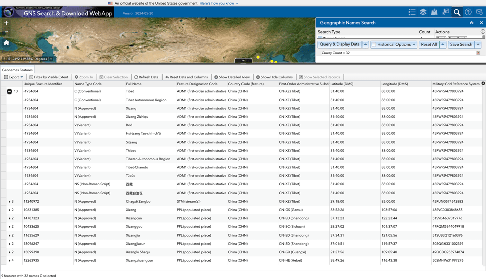 As both ‘Tibet’ and ‘Xizang’ are approved terms in GNS, it is not immediately clear why the USGS site would be populated with ‘Xizang’ over ‘Tibet’.