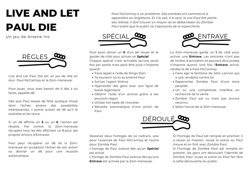 Live and Let Paul Die - Je tombe par hasard sur ce jeu totalement n’importe quoi, dans lequel on incarne le sosie de Paul McCartney qui tente de se dépatouiller dans un Londres plein de zombies, y compris le vrai Paul McCartney. Comme dans les meilleurs exemples du genre, Arsène prend sa blague très au sérieux et propose un système de jeu plutôt malin pour gérer sa bêtise, c’est donc un incontournable du JdR absurde pour moi !