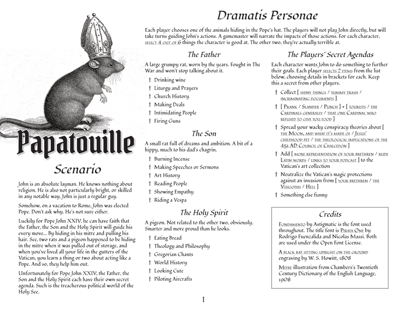 Papatouille - Voilà, des fois tu lances une game jam sur le Pape pour rigoler, et quelqu’un fait un jeu dans le thème, venant valider ta bêtise. Je suis bien content d’avoir poussé à la création d’un jeu, vu ma philosophie créative, d’autant plus que Papatouille est une réussite à tous les niveaux : derrière son titre des plus réussis, il y a l’histoire de John qui se retrouve pape par inadvertance et doit compter sur les conseils de deux rats et un pigeon pour se tirer d’affaire… Oui, c’est Ratatouille mais avec le pape, et des mécaniques de jeu piquées aux meilleurs. Je crois qu’on peut fermer la jam, y aura pas mieux !