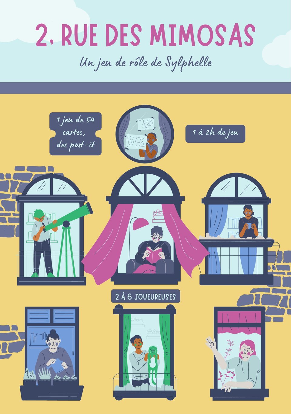 2, rue des Mimosas - Un jeu qui se passe dans un immeuble banal, dans lequel on saute d’un appartement à l’autre… pour découvrir les vies quotidiennes de ses habitant.es et leurs rencontres… Bon voilà, moi je vois un jeu qui ressemble de près ou de loin à La Vie, mode d’emploi, je fonce ! Je fonce malgré l’étrangeté de vendre un jeu sur un site de billetterie en ligne (après tout, pourquoi pas) et je ne suis pas très surpris de ne pas vraiment trouver un jeu qui aurait été du Perec dans le texte (ç’aurait été bien trop ambitieux, même si ça n’empêche pas d’autres d’essayer, mais on en reparlera…) mais quelque chose de plus simple. C’est peut-être même un peu trop simple, une fois passée la bonne idée d’utiliser les figures d’un jeu de cartes pour symboliser la façade du 2, rue des Mimosas ; mais c’est là mon envie d’avoir quelque chose sur ce thème de plus complet sous la dent qui s’exprime, et le jeu de Sylphelle se suffit très bien tel qu’il est !