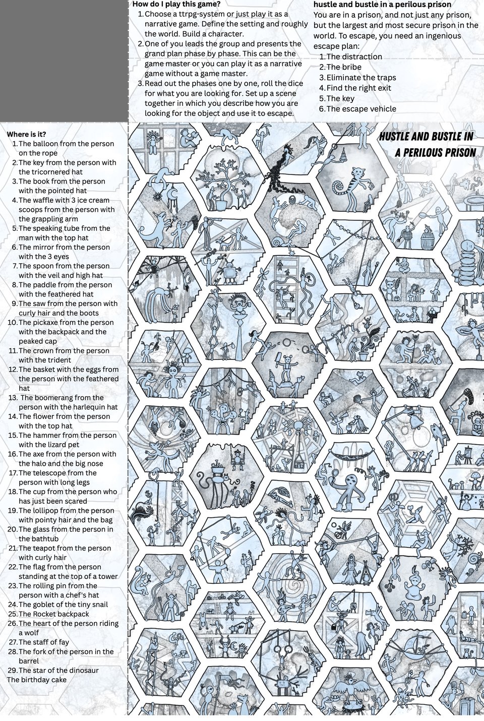 Hustle and Bustle in a Perilous Prison - Il y a en ce moment déluge de game jams passionnantes sur itch.io, dont la Cereal Box Game Jam à laquelle je n’aurai probablement pas le temps de participer et qui consiste à créer un jeu qui pourrait figurer au dos d’un paquet de céréales (en plus j’ai le jeu parfait pour ça !). Hustle and Bustle… utilise le format contraint de la meilleure façon, puisqu’il combine jeu de rôle et jeu de « cherche et trouve » : en réalité, le côté rôliste est juste une excuse pour prétendre qu’on est des personnages voulant s’échapper d’une prison, ce qui permet d’aller chercher dans les images proposées des éléments narratifs qui viennent nourrir ce scénario. Je suis très fan du graphisme gris et bleu, tout en courbes et hexagones, de l’ensemble !