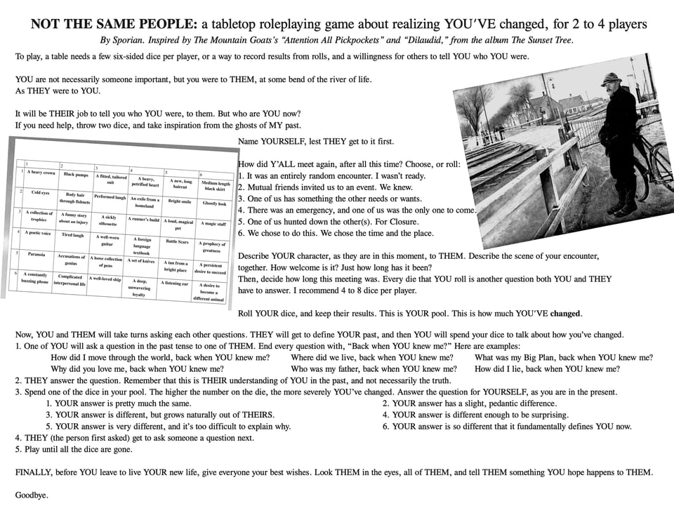 NOT THE SAME PEOPLE - Un jeu de plus à ranger dans la catégorie « On se retrouve après tant d’années », mais que veux-tu, je ne m’en lasse pas… Ici, ce qui est intéressant c’est que tout le dialogue entre qui était notre personnage avant et qui il est maintenant se passe dans les yeux des autres : comme dans Elle a voyagé / Elle est restée (j’vais m’gêner, tiens), ce pourquoi le personnage est important, c’est comment il était perçu, pas forcément la réalité. J’aime bien ce principe d’inversion, qu’on ne croise finalement pas si souvent dans le jeu de rôle, et qui va venir secouer un peu les principes pourtant si ancrés de perception intérieure du monde (voir « Par ailleurs » ci-dessous) !