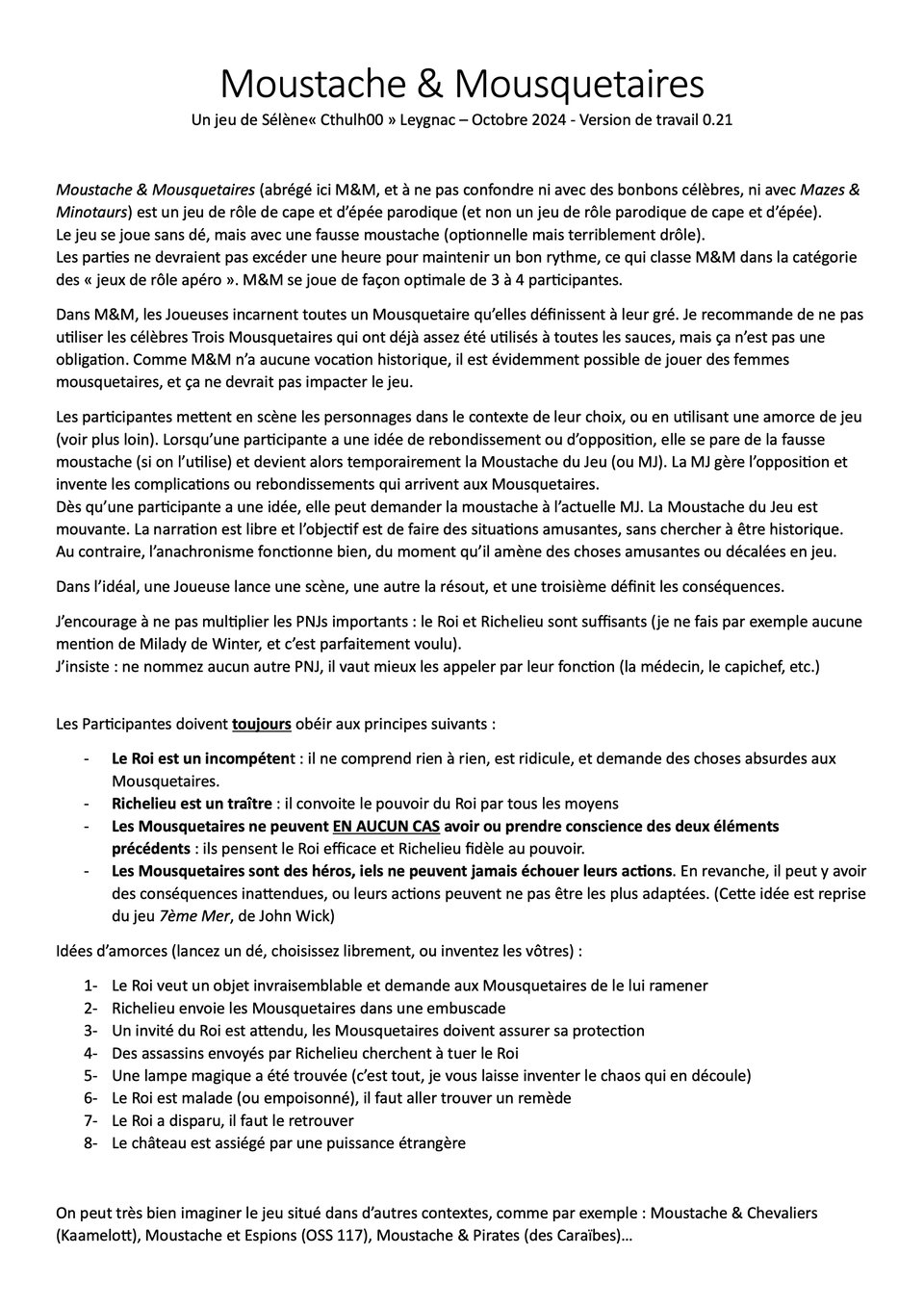 Moustache & Mousquetaires - Le « 0.21 » dans le nom du fichier n’y est pas pour rien : ce jeu en une page, sans MJ et sans dé mais avec une moustache, nécessite sans doute pas mal d’huile de coude pour en tirer le meilleur parti… mais, d’un autre côté, a-t-on vraiment besoin de plus qu’il ne fournit, à part peut-être une connaissance minimale des clichés du genre de cape et d’épée, pour fournir une expérience intéressante ? Je n’en suis pas si sûr : tout le monde tombera d’accord pour dire que l’outil indispensable, c’est vraiment la fausse moustache.