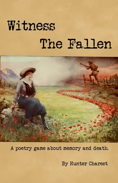 Witness the Fallen - Attention, là on plonge dans le jeu de rôle expérimental réservé aux expert.es, ou en tout cas aux personnes amatrices de choses vraiment en dehors des clous ! Car je ne sais pas à quel point on peut qualifier ce jeu, qui se propose de désosser un poème pour faire l’éloge d’un personnage décédé avant de recomposer d’autres poèmes avec les mots piqués jusqu’ici, comme jeu de rôle à proprement parler (en opposition à une sorte d’exercice d’écriture sur lequel on a déposé une légère couche de fiction). Peu importe au final car l’idée est vraiment belle, et me confirme que je ne suis pas le seul à chercher depuis un certain temps les passerelles possibles entre jeu et poésie…