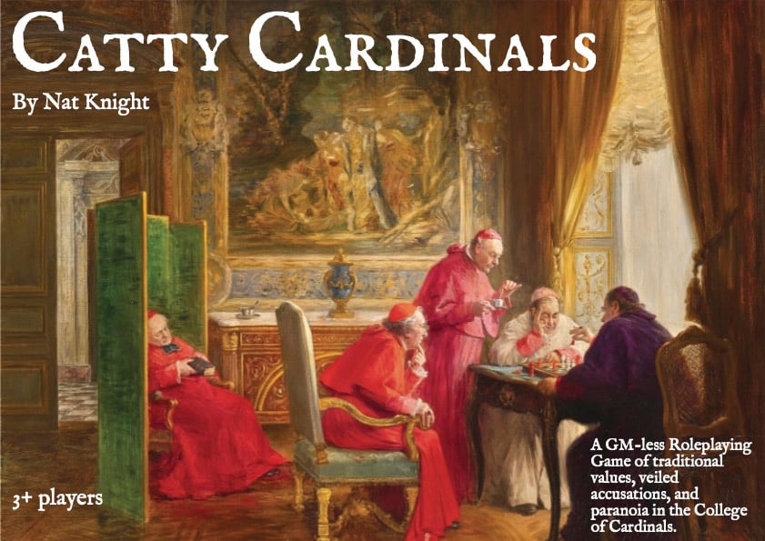 Catty Cardinals - Ultime entrée dans la Pope Gam Jam que j’avais lancée comme une blague il y a quelques temps et qui a finalement donné de fort bons jeux, cette contribution nous met dans la peau de cardinaux conservateurs tout à fait pas contents du nouveau pape progressiste, une situation totalement fictionnelle donc. Ce qui fait son sel, c’est que les cardinaux ne peuvent bien sûr pas faire explicitement part de leur désarroi, ce serait inconvenant et risquerait l’ire de la Suspicion, rôle tenu par un autre joueur. Bref, Catty Cardinals est un jeu où il faut sous-entendre ce qu’on ne peut dire, ce qui résume je crois 90% des interactions sociales humaines ?
