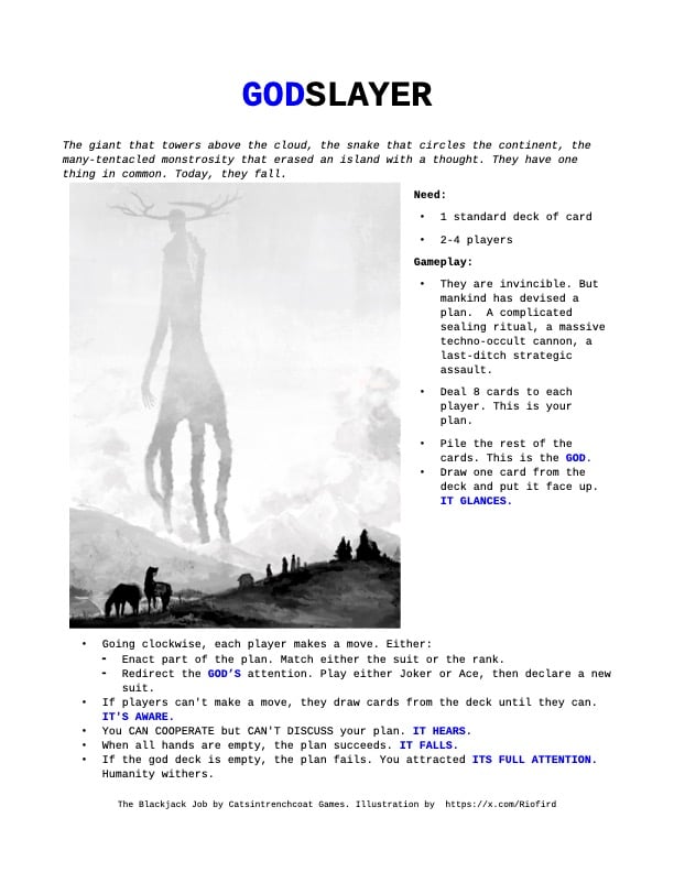 Godslayer - La blague du jeu, révélée dans sa note d’intention, est qu’il est une copie quasi conforme du Uno, sauf que là on essaye de détruire un dieu ancien, vengeur et omniscient… Ben moi j’y vois pas une blague mais une façon très élégante de se réapproprier un jeu de société ultra-connu en y injectant des mécaniques rôlistes et changeant tout à fait son atmosphère d’habitude colorée ! Non vraiment, j’y vois plutôt du très bon game design qu’une blague.