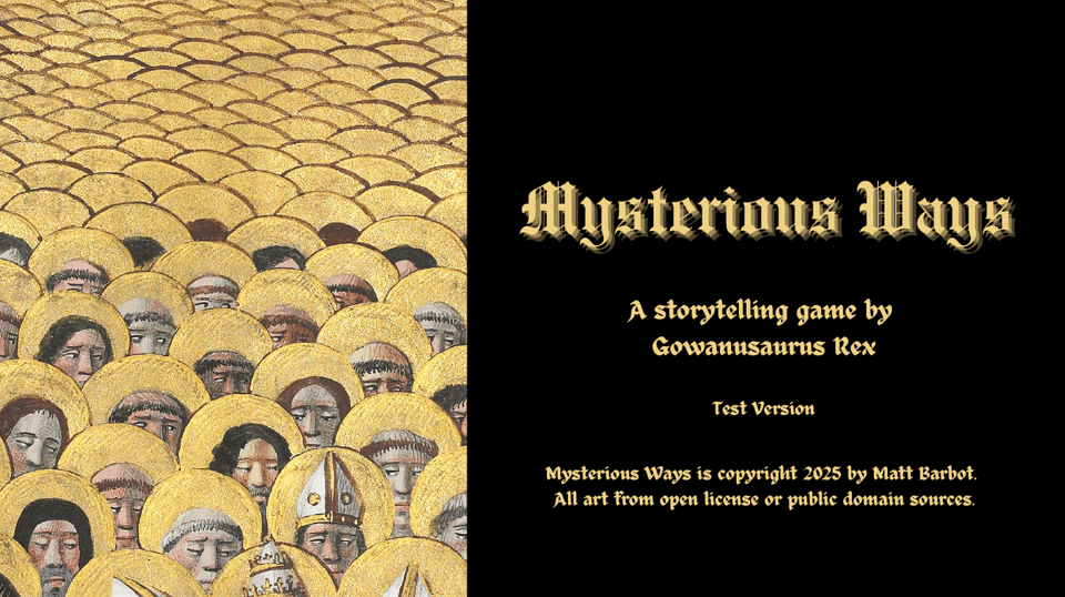 Mysterious Ways – Je suis sincèrement touché que mon idée de jam à la con continue de produire de belles choses, tel ce jeu a priori écrit par quelqu’un de croyant et qui parle de miracles qui n’en sont pas forcément, ou plutôt d’actes qu’on va tout faire pour faire passer pour des miracles. En cela il s’inscrit dans la grande tradition des jeux de parlotte dans lesquels le but est d’avoir la foi la plus mauvaise possible, ce qui me paraît tout à fait approprié vu le contexte !