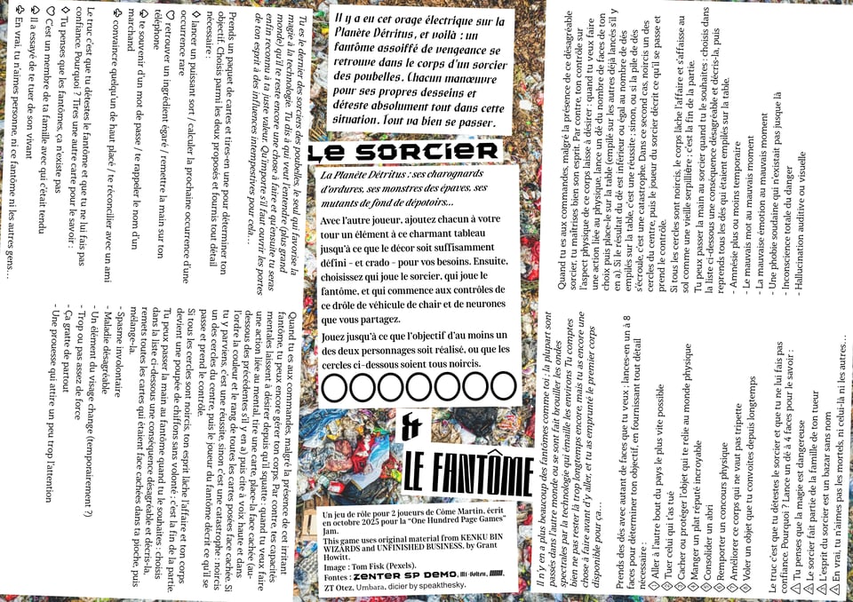 Le Sorcier & le Fantôme – Cependant, je n’ai pas tenu longtemps ma promesse à Jean-Baptiste puisque 2 jours plus tard, voici un nouveau jeu sortir de mon cerveau… C’est pas ma faute, il fallait que je boucle ça avant fin octobre pour être dans les délais de cette jam qui proposait de faire fusionner 2 jeux de Grant Howitt. J’ai tiré au hasard un truc avec des magiciens des poubelles, un autre avec des fantômes revanchards, il me semblait donc naturel de faire un jeu pour 2 avec un fantôme coincé dans le corps d’un magicien, avec un système asymétrique. Je suis plutôt satisfait de moi compte tenu des cours délais, à l’exception de la maquette : j’aurais vraiment voulu caler quelques dessins rigolos de ma main, mais en une page, c’était trop juste...