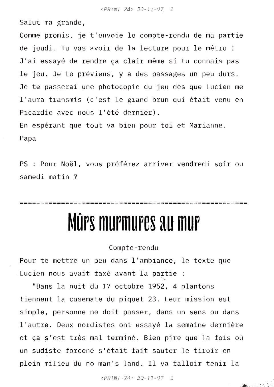 Mûrs murmures au mur – Lors de notre dernière réunion de l’OuJePo (je ne t’ai pas encore parlé de l’OuJePo ? Rassure-toi, ça viendra) nous avions pour tâche de créer un fragment faisant partie d’un jeu de rôle qui n’existe pas, histoire de voir si ça pouvait tout de même tenir debout. L’ami Marc nous a tous.tes coiffé.es avec son Mmam, faux compte-rendu d’un faux jeu tiré d’une époque révolue et n’ayant jamais tout à fait existé : il y a quelque chose de très poétique dans son petit texte, et de très ludique aussi puisqu’on a immédiatement envie d’essayer de remplir les interstices (une fois de plus) et de croire mordicus à ces mûrs murmures. Bon, la fonte n’est pas tout à fait d’époque, mais elle est si jolie qu’on lui pardonne...