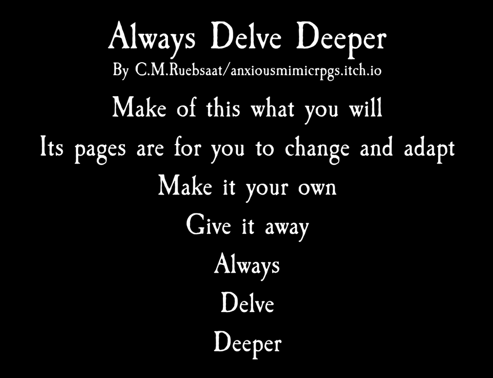 Always Delve Deeper – Il y a ce principe, dans les jeux de la famille de l’OSR, qui consiste à dire que les règles ne sont là que pour couvrir les cas où on ne peut arriver à une décision par la discussion ; en l’état, les règles sont donc volontairement incomplètes et Always Delve Deeper pousse cette logique à son maximum en proposant des bribes de règles, des tables aléatoires reliées à rien de précis, en comptant sur son lectorat pour combler les trous. Ça marche impeccablement, en se contentant d’évoquer un univers rendu plus riche par ses non-dits, surtout lorsqu’il est aussi bien écrit et plein de choses très originales, ce qui n’est jamais évident dans une famille déjà bien remplie...