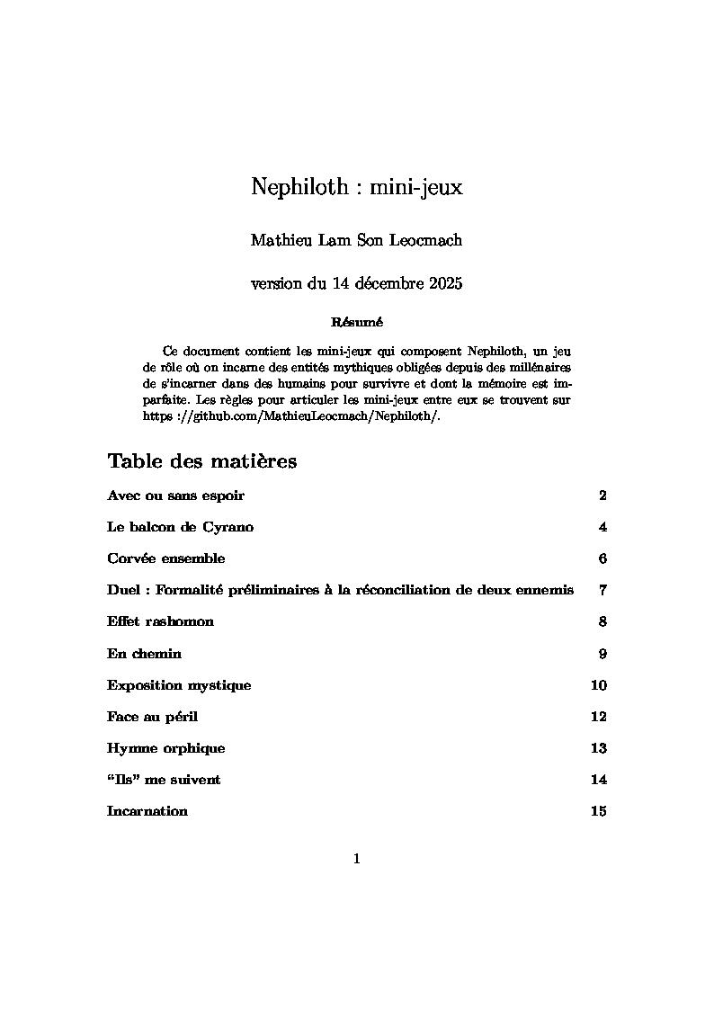Nephiloth – Il y a les déraisonnables comme moi, qui sortent plus de jeux en un an qu’une année comporte de mois, et il y a ceux qui prennent leur temps, raffinant méticuleusement leur projet jusqu’à ce qu’il soit le meilleur possible. L’ami Mathieu est de ceux-là, proposant ici la version de travail d’un jeu qui l’occupe depuis des années, une version largement maniée de Nephilim à la sauce Firebrands, ou pour le dire de façon moins obscure, la possibilité d’incarner des êtres mystiques et immortels à travers une série de mini-jeux narratifs. Pour avoir testé la bête, je peux attester que ça marche très bien ; je dirais bien que j’ai hâte de voir la suite, mais je sais que c’est une hâte qui va se compter en années...