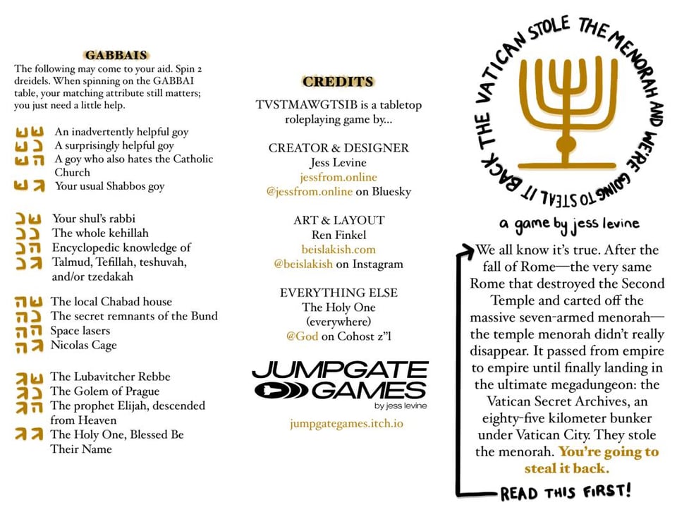 The Vatican Stole the Menorah and We're Going to Steal it Back – Je ne connais que très peu de jeux de rôles qui plongent entièrement leurs racines dans la culture juive, et encore moins qui le font de façon humoristique ; TVStMaWGtSiB est même probablement le seul exemple du genre ! Un jeu drôle, pédagogique (puisqu’accompagné d’un lexique pour les goys) et qui propose en outre de faire un casse au Vatican, c’est difficile d’y résister...