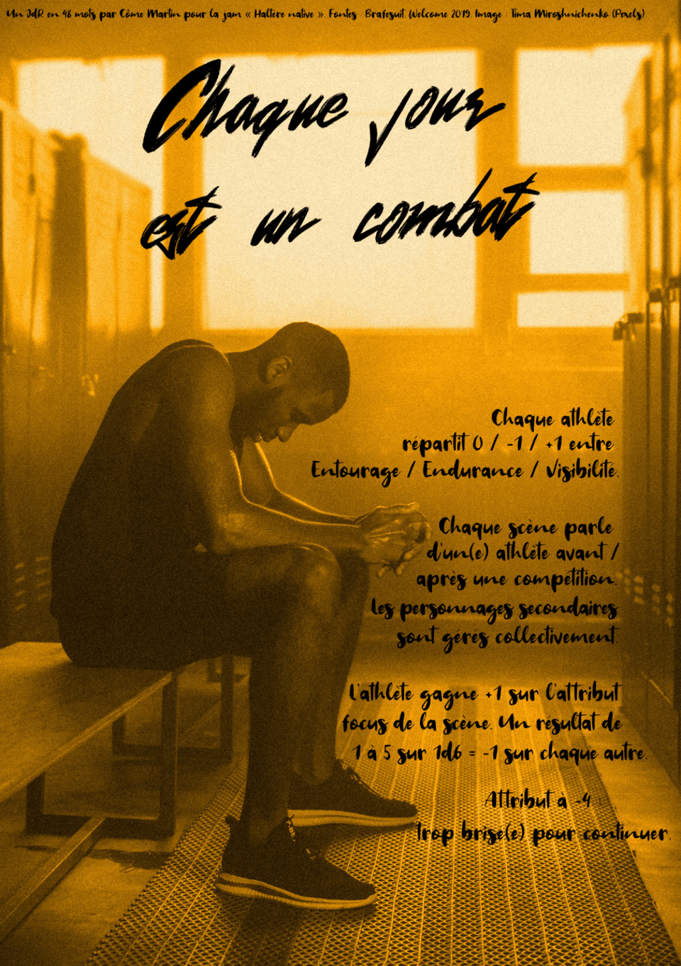 Chaque jour est un combat – Oui oui, je comprends, tu as peur que comme l’année dernière je commence à sortir un nouveau jeu par semaine… Je ne suis pas là pour te rassurer mais je t’assure que je fais de mon mieux pour prendre mon temps ; c’est juste que ça ne fonctionne pas, surtout quand les copains lancent une game jam et que tu as envie d’y participer. D’où ce nouveau petit jeu en 48 mots, qui parle du quotidien d’athlètes en proposant de jouer tout sauf le sport en lui-même ! J’avais envie de rendre hommage aux catcheurs et catcheuses vues le mois dernier, à ma façon...