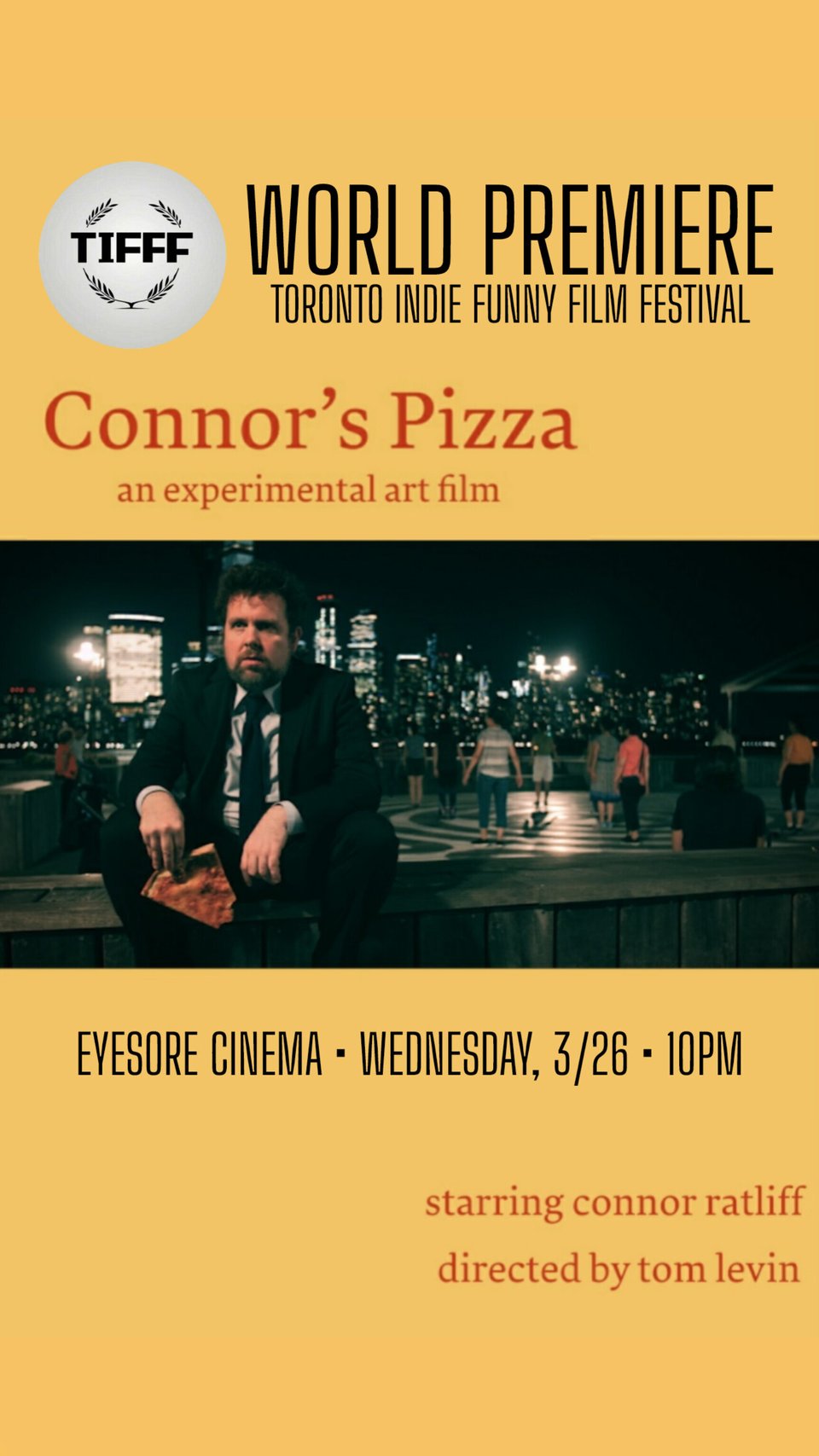If you live in Toronto — or know people who do — please help spread the word about this Wednesday's world premiere screening of Connor's Pizza, selected by the 1st Annual TIFFF (Toronto Indie Funny Film Festival). It will be playing at 10pm on 3/26 at Eyesore Cinema, and your ticket comes with a free slice of pizza!