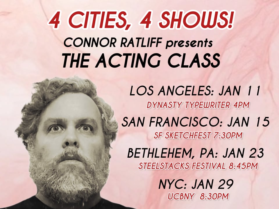 I’ll be bringing CONNOR RATLIFF presents THE ACTING CLASS back to Dynasty Typewriter for a 4pm show on Sunday! Possibly with a SPECIAL GUEST! In-person & livestream!