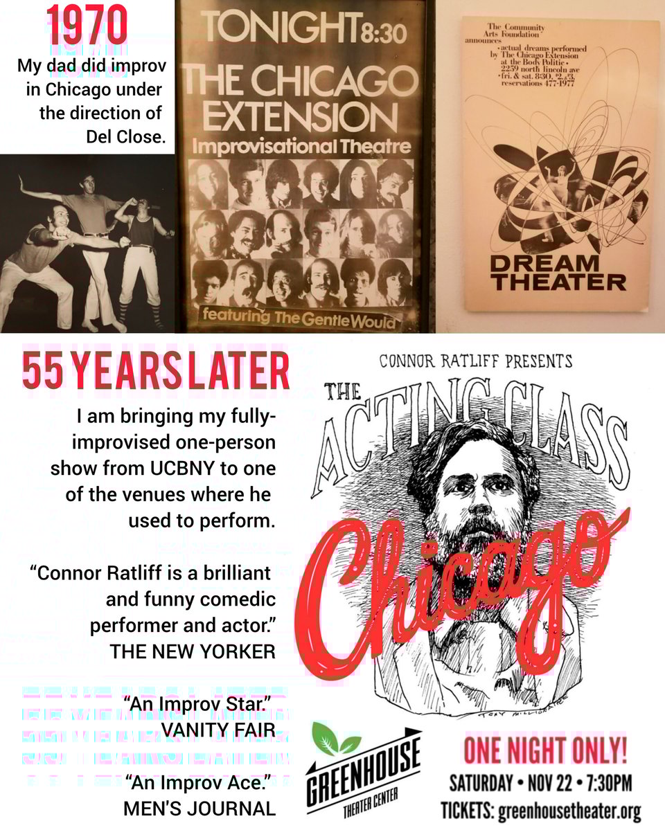 I took a risk in renting this venue -- for sentimental reasons, because it is the same building where my dad used to do improv with The Chicago Extension back in 1970/71 -- and I need for a few dozen more people to attend in order for this to not be a debacle! I know that there have to be a few dozen more Chicagoans who would enjoy this show who simply have not heard about it, despite my best efforts to publicize the show. It turns out it is kind of difficult to promote a one-off improv show in the Windy City.