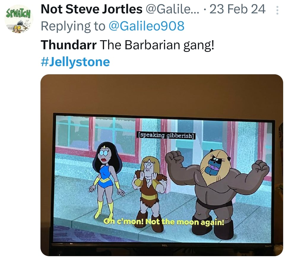 Here's a fun thing: I am the voice of THUNDARR THE BARBARIAN in a just-released episode of the animated series, JELLYSTONE on MAX.