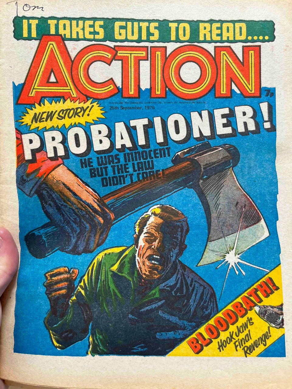 As far as I know, Probationer never completed its sentence. It was one of the strips that was disappeared when Action was put on hiatus, dragged off sale by a tabloid furore over violence. (Action would later return, in adulterated form. But it was not what it was, and was folded into Battle not long after.) Probationer is sadly, unlikely ever to be released again.