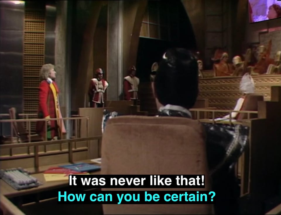 It would be easy to see this as him calming down, slowly working his way back towards his normal personality through the confusion, rage and paranoia the machine has pumped into his mind. He is, metaphorically speaking, no longer drugged out of his mind, but his judgement is massively impaired and his priorities severely skewed. If this is the case, and the sole explanation for what happened on Thoros Beta, then the courtroom Doctor’s attempts to explain his actions as "a clever ploy" and "a plan" are the character ex post facto rationalising behaviour he cannot accept. As is his insistence that the Matrix itself has been compromised and is showing things that didn't happen.