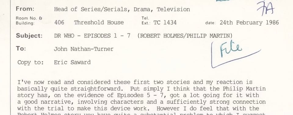 We know that BBC Head of Drama Series and Serials Jonathan Powell approved Martin's scripts with no changes when he read them. Eric Saward recalls doing little work on them, and Martin suggested (again on the commentary) that Saward's work was largely devoted to continuity related matters in the courtroom scenes. The surviving production scripts throw up very few textual variations within them, and there is little difference between them and the finished serial or indeed between the serial and Martin's 1989 novelisation.