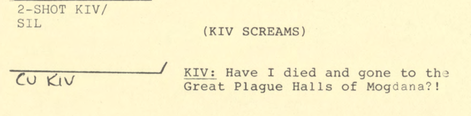 Other minor changes include names. The rebel known as Vern is Ger in the book (and presumably Martin's earlier script). Both Yrcanos and Kiv referencing the same mythology "the plague halls of Mogdana", mentioned in Doctor Who - The Discontinuity Guide as an example of how the Mentors may have corrupted Thordon's culture with their own, is two separate references in the book. Kiv worries he is dead and in the "belly of Sanscrupa". (Intriguingly there is noticeable physical evidence of tippexing and retyping on the BBC's archive scan of this page of the script.)