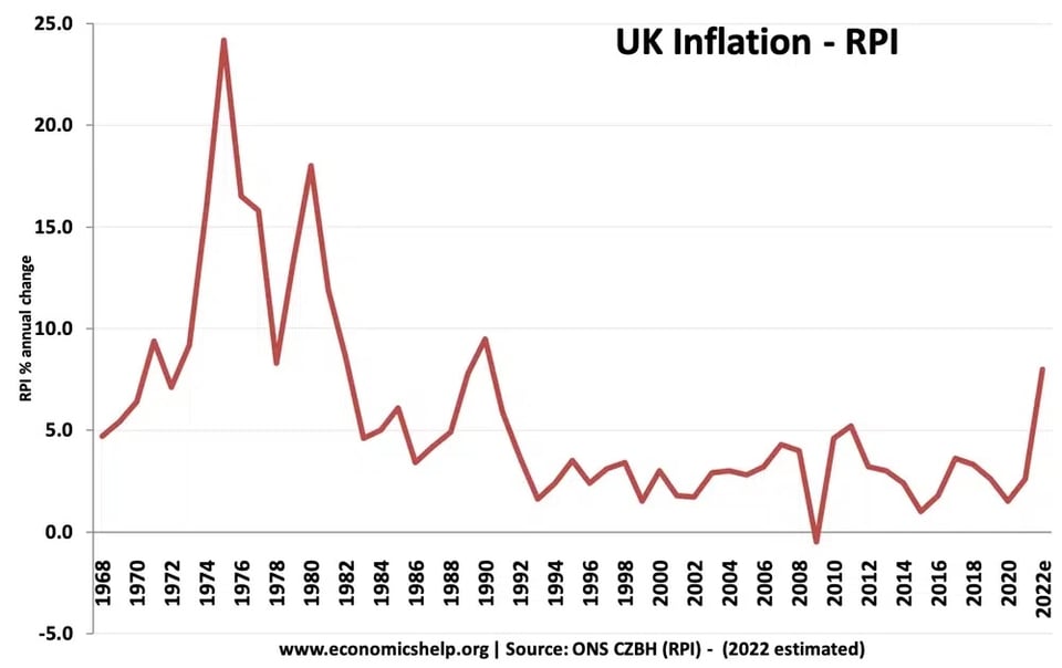 Now, that's just not true. Not merely because inflation doesn't really work like that, or even because in 1977 much of Doctor Who’s production budget was in BBC “man hours”, a nebulous concept with little real link to cash expenditure or real world economics. It’s also because inflation was falling for almost all of Williams' time on Doctor Who.