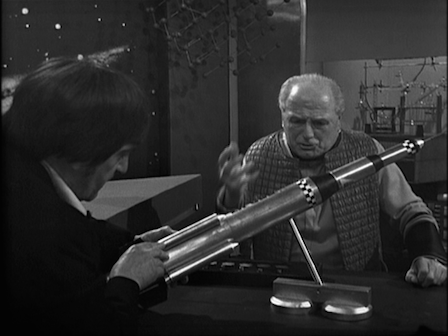 But the truth is, The Seeds of Death is a fabulous production, an incredible piece of late 1960s VT drama. Director Michael Ferguson, working in the unenviable environment of Lime Grove Studio D, a space considered unsuitably cramped and primitive for Doctor Who in 1963, achieves wonders. He places his cameras high in order to maximise shooting space; small rooms like the cupboard in which characters hide from the Ice Warriors are viewed chiefly from their own ceilings. He projects images onto actors faces to suggest they’re in a vast rocket control room, not the corner of a reused museum set, and from half way though the story he starts standing one of the non-speaking Ice Warriors against the throbbing light background in Moonbase’s main control room, creating unusual light patterns and a greater sense of space.