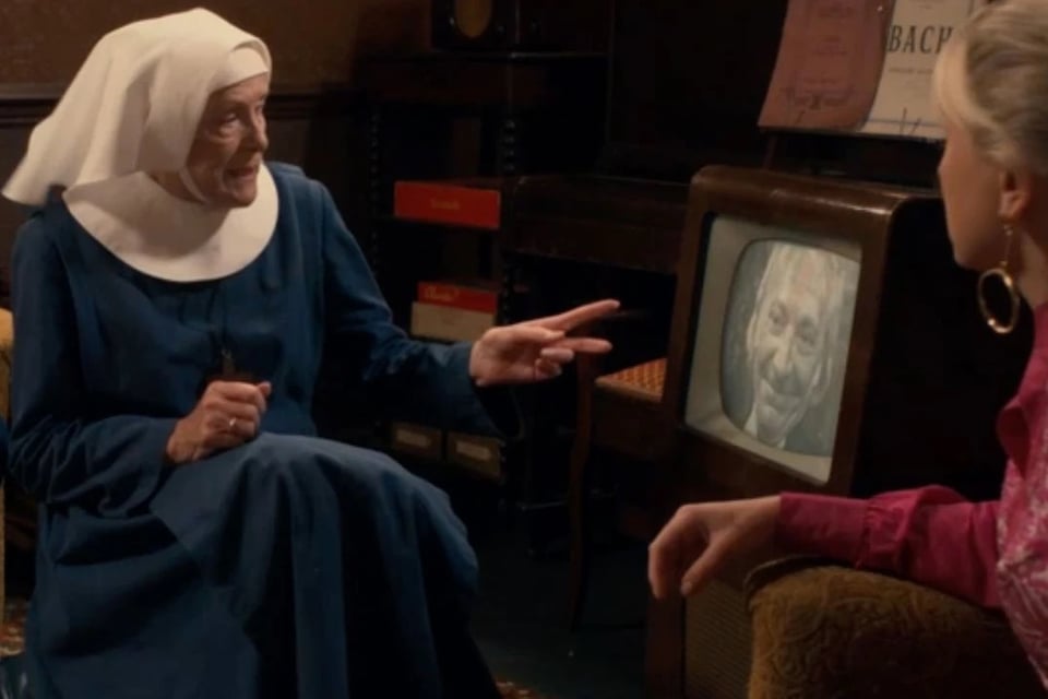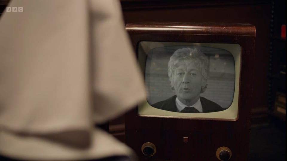 But what has all this to do with Doctor Who? Other than her diagnosis being delivered by his brother?1 As I’m sure many of you are aware, Sister Monica Joan has been portrayed on the series as a keen viewer of old money Doctor Who on original transmission. Viewers have seen her comment on The Aztecs, stick with the show through the post Dalekmania ratings crash and on into the Troughton era and The Abominable Snowmen and most recently worry about missing Spearhead from Space Episode Two. A process she brought to an end by giving the reluctant television a thoroughly Doctorish whack with her cane.