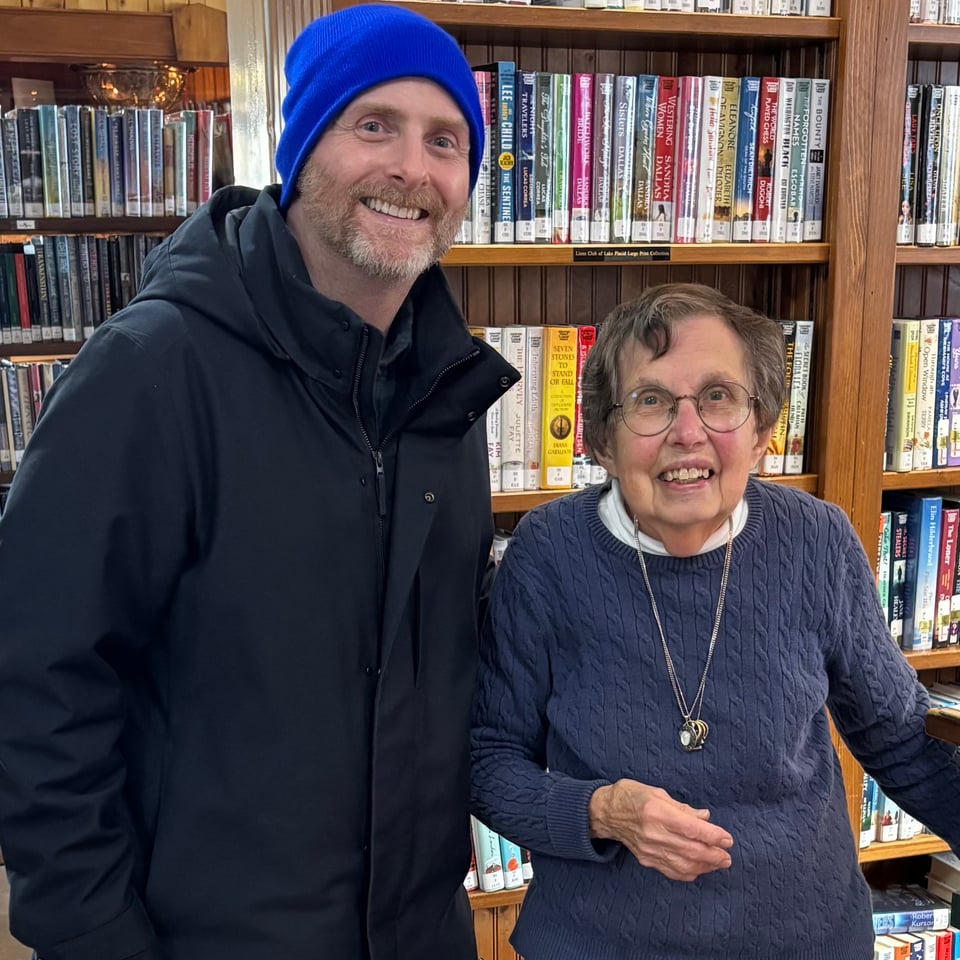 I hope everyone is surviving as best they can. Here’s a pic of me and Linda Blair, one of the Librarians at the Lake Placid Public Library. She been there for 45+ years!