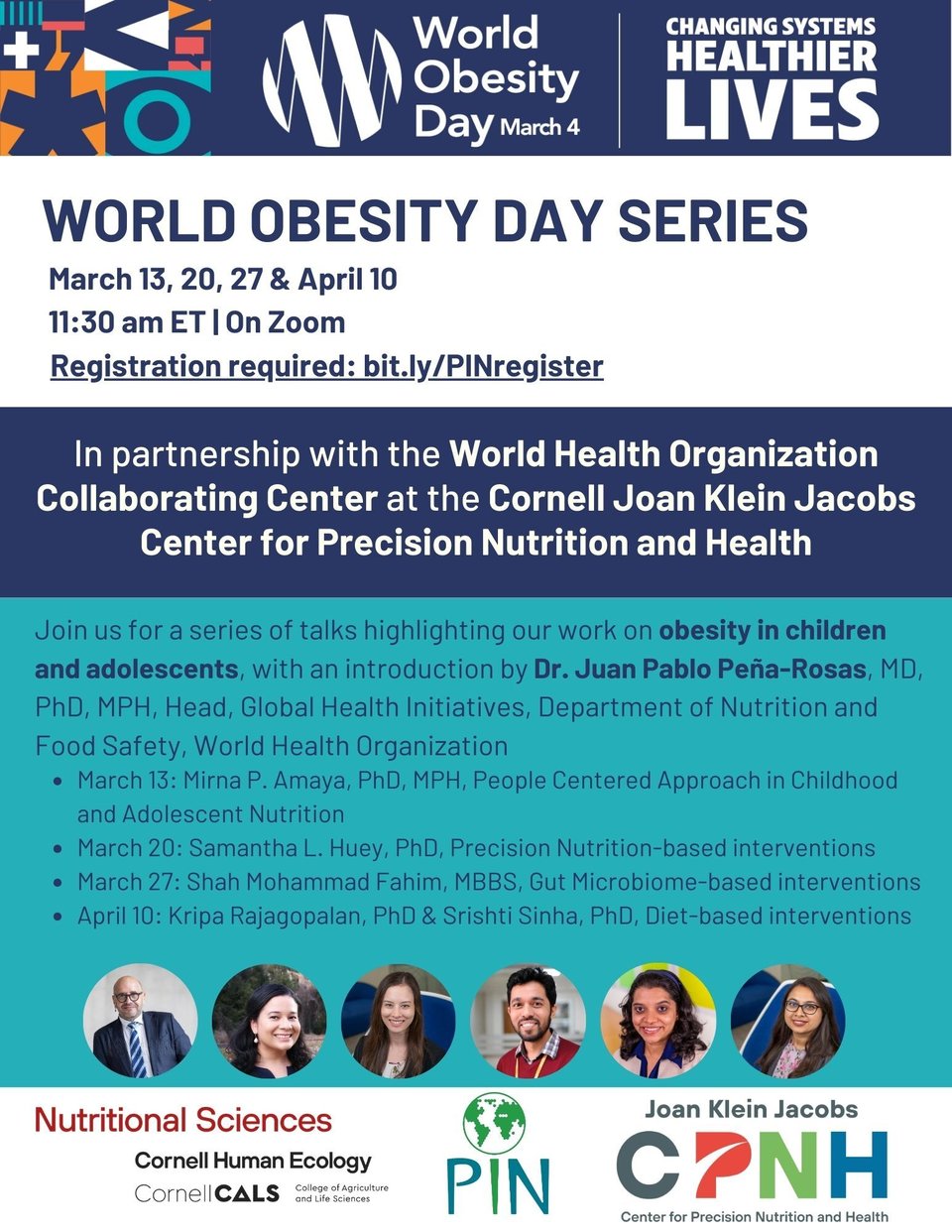We are pleased to share this newsletter with updates and activities in and around the field of international nutrition and global health. Please join us as we mark World Obesity Day with a series of talks in partnership with the World Health Organization Collaborating Center at the Cornell Joan Klein Jacobs Center for Precision Nutrition and Health. The first talk is this Thursday, March 13th with Dr. Mirna P. Amaya, sharing perspectives on people-centered approaches to managing obesity, with an introduction by Dr. Juan Pablo Peña-Rosas.