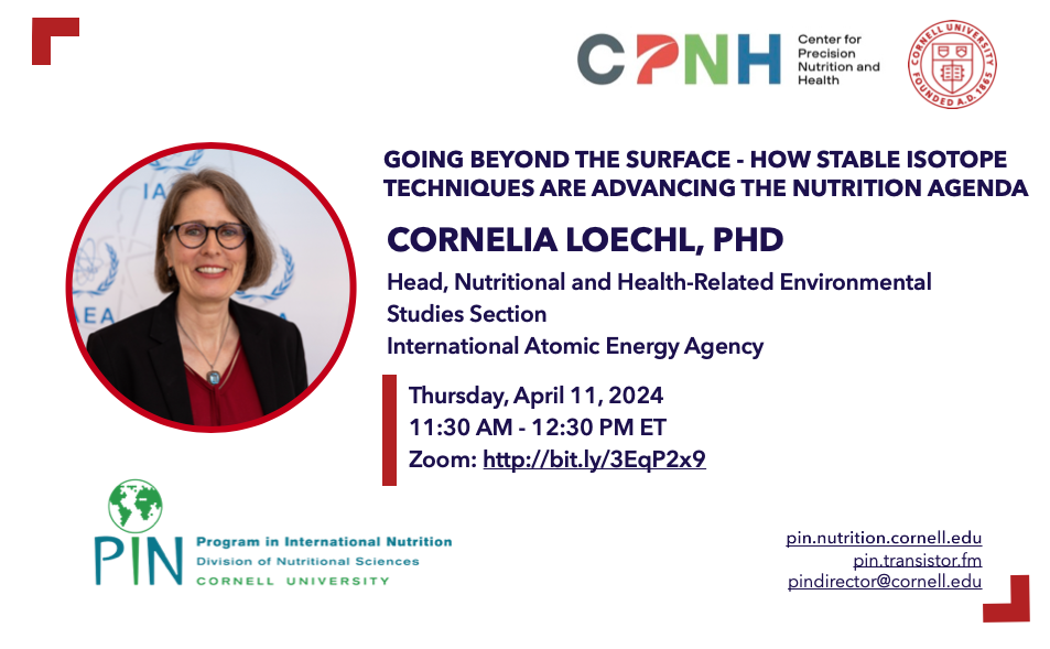 We are pleased to share this newsletter with updates and activities in and around the field of international nutrition and global health. Please join us as we host Dr. Cornelia Loechl of IAEA on April 11th. As always, we welcome your continued engagement with our program. Please send any content you would like to see shared in this newsletter to pindirector@cornell.edu.