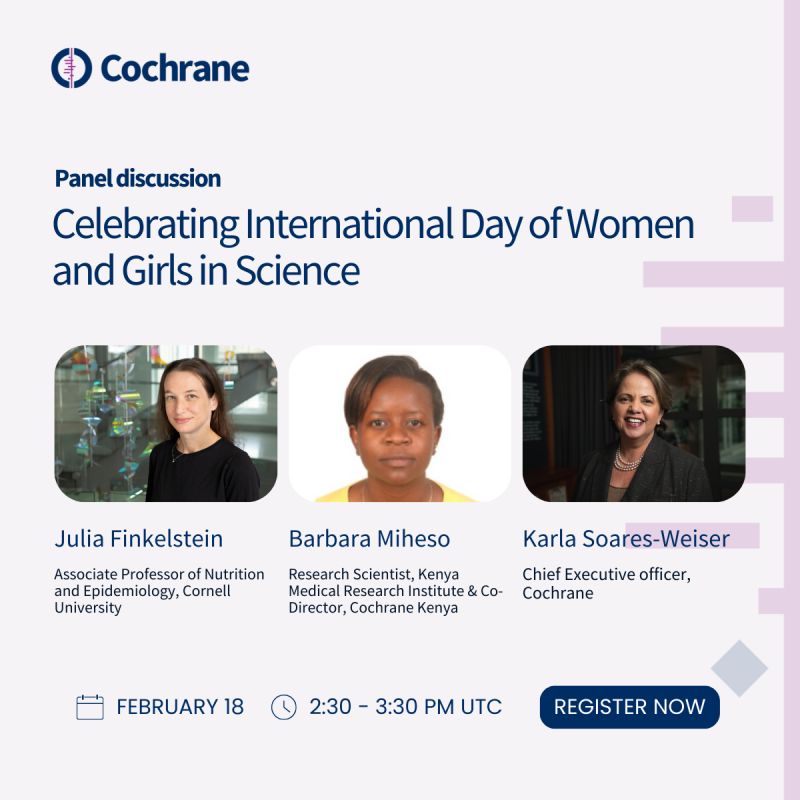 To mark international Day of Women and Girls in Science, Cochrane is hosting a panel of accomplished women - Julia Finkelstein, Cornell University and Bakhita Barbara Miheso, Kenya Medical Research Institute, chaired by Cochrane CEO Karla Soares-Weiser. Register.