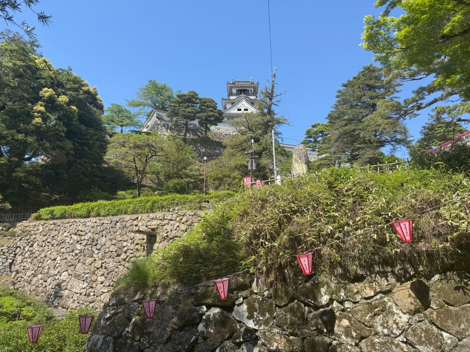 It wasn’t far to Kochi castle from there; no surprise, it’s on top of a hill (and those are getting a lot easier for me to climb, woohoo!). It didn’t cost much to enter, so I did; as per usual, both of my shoes wouldn’t fit in a single shoe locker, so I had to use two of them! (Yes, big feet are a problem in this country.) Lots of steep staircases with minimal headroom in there and my head is still a bit swollen from hitting it on a signboard suspended from the ceiling of a train yesterday, so I took it slowly and did by best not to re-injure myself. It was sunny with clear skies today, so views out over the city were fantastic, but the view back up to the castle is I think a better picture: